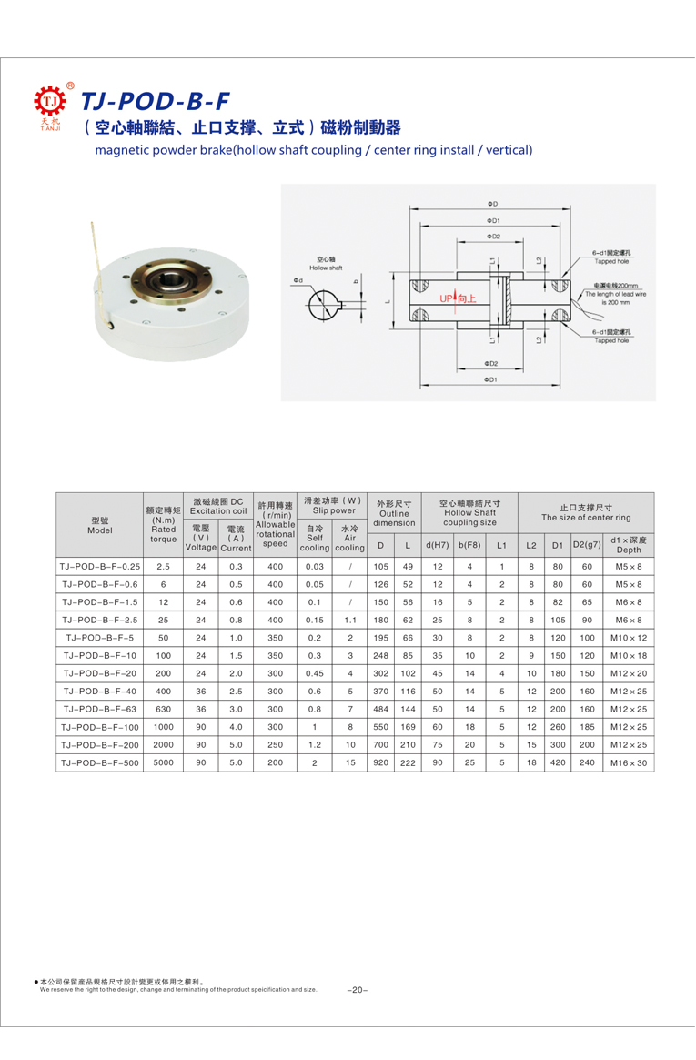 東莞天機傳動廠家生產(chǎn)的空心軸磁粉剎車器又稱立式磁粉剎車器是磁粉制動器中的一種??招妮S磁粉剎車器價格分為:TJ-POD-B-F、TJ-POD-B、TJ-POD-A、TJ-POD-B-E。這幾種型號的磁粉剎車器都為空心軸連接,立式止口支撐,使用的DC24V安全電壓。