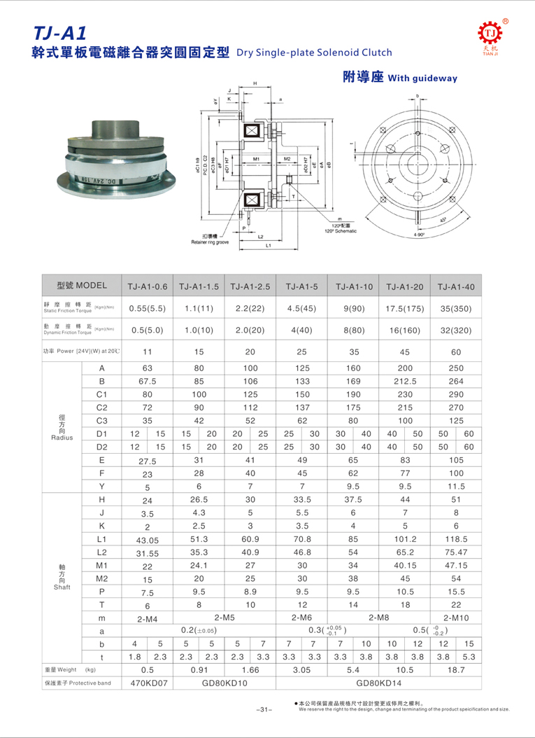 單片電磁離合器(突圓型電磁離合器)型號選型參數(shù)表如下: