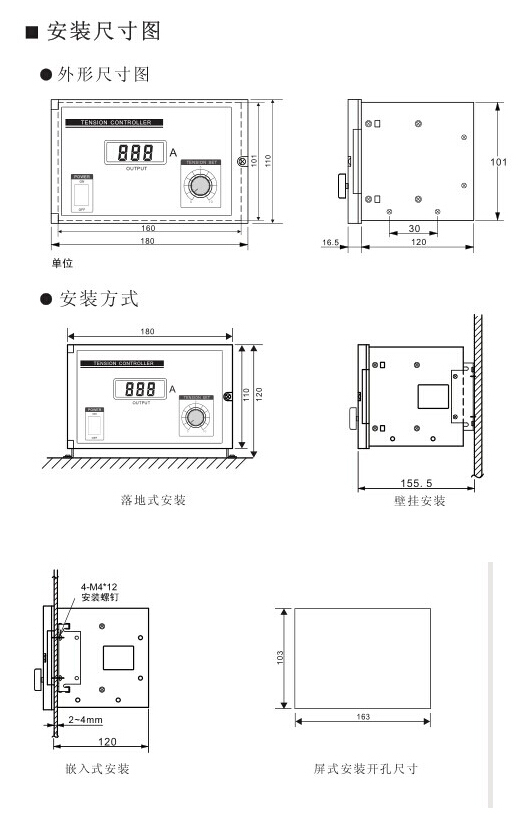 磁粉手動張力控制器的安裝方式有落地式安裝、壁掛式安裝、面板鑲嵌式安裝三種常見的;
