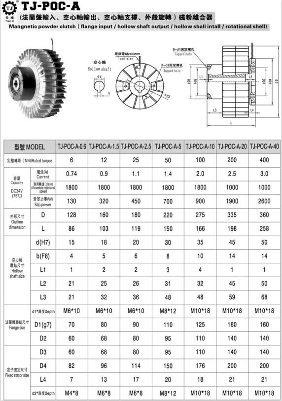 中空軸磁粉離合器廠家型號(hào)分為:TJ-POC-A-0.6、TJ-POC-A-1.5、TJ-POC-A-2.5、TJ-POC-A-5、TJ-POC-A-10、TJ-POC-A-20、TJ-POC-A-40;等更大轉(zhuǎn)矩的磁粉離合器。空心磁粉制動(dòng)器和中空軸磁粉離合器廠家型號(hào)表如下: