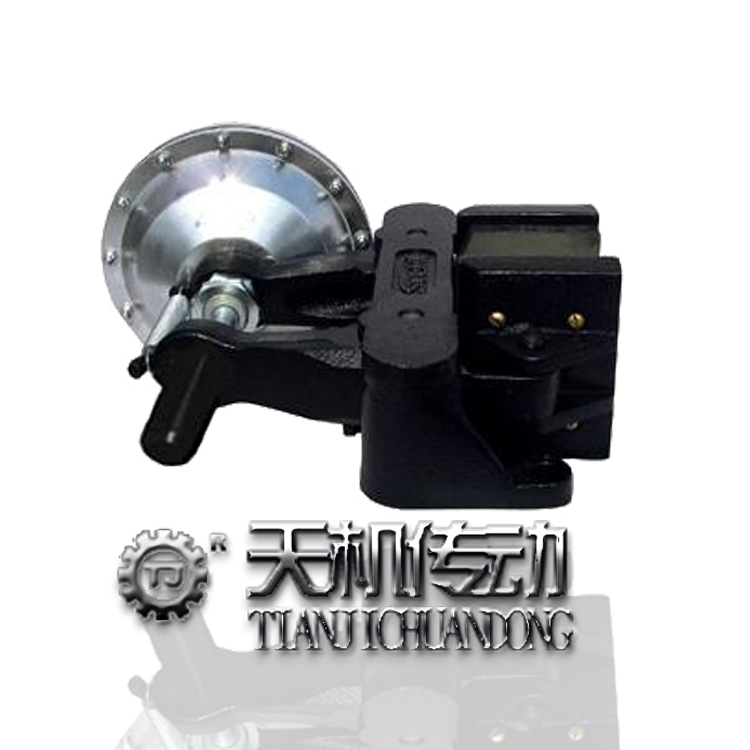東莞天機傳動生產銷售的DBM-10油壓碟式制動器,DBM-20油壓碟式制動器統(tǒng)稱油壓碟式制動器,是裝設于車輛剎車系統(tǒng)上,其包括有對應剎 車盤片的滑座、定位在車輛上的本體,該滑座則配合復位彈簧滑設在本體上。且本體配合滑座設有一控制閥組,該本體對應該控制閥組設有一個連接車輛油壓系統(tǒng)的 油壓槽,而油壓槽則以迫掣組件迫掣剎車盤片;藉油壓增壓將本體的迫掣組件推動 剎車來令片夾掣剎車盤片進行剎車動作,藉剎車慣性作用力大于復位彈簧的彈力時 會讓滑座在本體上位移,而滑座的位移量到達默認值(設計為慣性力較大值)時會運 用控制閥組關閉車輛油壓系統(tǒng)的通路,再將油壓槽油壓釋壓,讓剎車壓力在瞬間降 低,并利用一復位彈簧的彈力再讓滑座復位,藉此讓滑座產生往復弧線運作,致使 本發(fā)明的碟式剎車器過度掣緊于該剎車盤片。